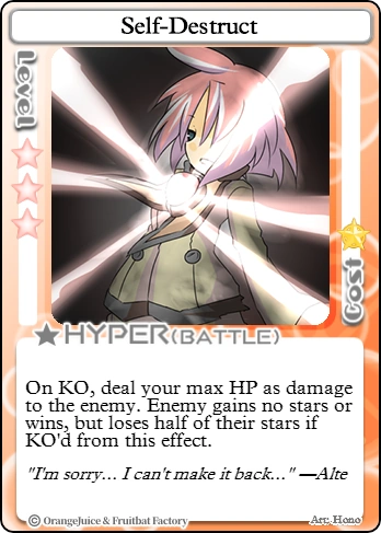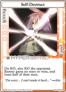 The main advantage that Self-Destruct has over any other Hyper is the unease generated by the card itself and its extremely cheap price. Opponents will often be wary of attacking Alte the longer the game progresses, as the risk of their assault backfiring will be ever-present. However, this is a double-edged sword, as the player may have to try to initiate combat themselves and damage their own health, and if Alte uses Self-Destruct while attacking and KO's the opponent, the Hyper will be wasted. In many cases, HP depletion will naturally occur throughout the game via landing on