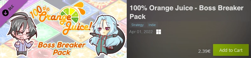 In response to some of the most long-standing requests, the highly anticipated 100% Orange Juice - Lone Rider & Scientist Character Pack is finally here alongside version 1.18 ~Lonely Chariot~! Lone Rider Gain +1 to all Move rolls. Hyper: Full Throttle (Boost) Scientist Hyper: Avion Fire (Battle) The character pack is available for the low price of $9.99 with a - 2.5% launch discount! In order to reach equiblirium in character genders, the next 10 character packs are planned to feature all male characters.
