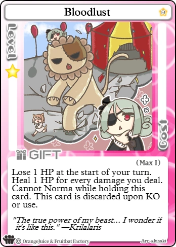 Bloodlust is a gift for offensive characters that want to be in combat as much as possible. By healing back the damage taken in combat, Bloodlust allows the holder to survive more fights, especially if they rely on blocking for damage mitigation. Balanced fighters like and more fragile ones like are able to keep their health at a much safer level with this card, provided that they can find opponents to fight. is an excellent user of this card due to his high HP pool paired with his monstrous ATK stat. It should be noted, however, that Bloodlust will not trigger from his self-damaging passive when he discards a card. If the player finds themself isolated, it can be better to give up the effect by discarding Bloodlust due to the passive HP drain it inflicts on the holder. Doing so has no penalty other than losing the healing. Sometimes, however, it can be better to take the KO, as the user does not lose any stars and won't give wins to their opponents. can play this card in her deck for this reason, even though she cannot benefit from the healing passive.