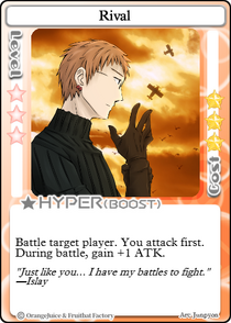 Though potent, Rival has some weakness. For one, it is telegraphed - opponents know when it is coming, unlike battle card Hypers, which can be a surprise in a battle. This gives players some leeway in shutting it down. can end the battle entirely, and players can prepare for a big hit by usage of any defensive card. Rival is also very expensive at 30 stars, only offering +1 ATK for the cost. This may not be enough if the player using Rival needs to KO a 2 HP or higher opponent, who may roll high for defense, effectively wasting the card.