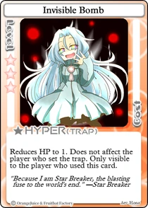 Star Blasting Fuse is a relatively inconsistent Hyper due to its random trap placement. When activated, the resulting Invisible Bomb traps become an unseen hazard to any player unfortunate enough to land on one. The main advantage of this Hyper is that it affords Star Breaker an excellent opportunity to KO an opponent while they're at their most vulnerable at 1 HP. As a result, it can be extremely effective against high HP and tank characters such as . While the Hyper itself is quite expensive for most characters at the price of 30 stars, the price is advantageous for Star Breaker as it will enable her to deplete her star count if she is near being KO'd. Also, since she cannot complete Star Norma, the Hyper is essentially free for use as long as she has enough stars, and there is little reason to hold onto the card for very long.