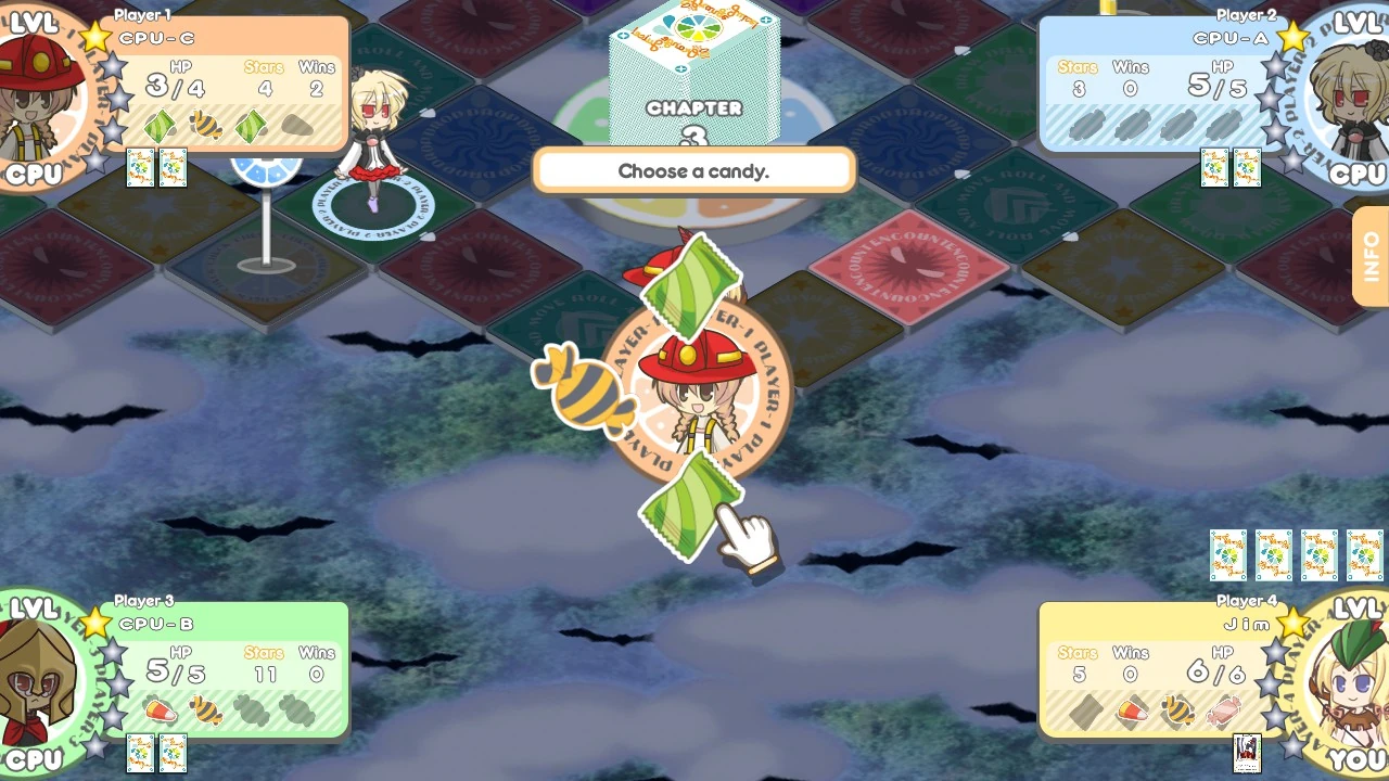- Each player starts the game with a single piece of candy in their inventory and gains an additional piece of candy every third chapter. At the start of the player's turn, they will gain 1 star for each held candy.