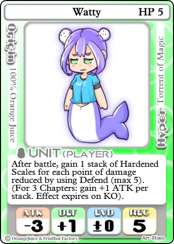 - When this card is used by Watty, the player gains +2 DEF. In addition, the maximum amount of Hardened Scales stacks the player may have at once is increased from 5 to 10. Once 10 stacks of Hardened Scales are reached, it will instantly KO all units other than the player.