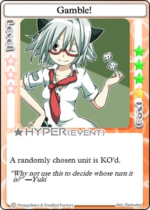 Gamble! as the name implies, is a Hyper that randomly KOs a single player with the chance of KOing the player themself. The main advantage of this Hyper is that the KO effect goes through any health amount which can be effective against opponents such as who have the potential to have very high health. The Hyper itself is unique in that it does not deal damage, it simply KO's the opponent. Thus, "Gamble!" will ignore the effects of and and KO the opponent. Assuming "Gamble!" hits a favorable target, it can be used to delay a player from achieving a Norma or to prevent them from attacking the player. A very common use of the Hyper is to use it with the intention of suicide, which often happens. This is ideal when Yuki has low health, as she will revive with full health, once again. Another minor advantage of the Hyper is also that it is extremely cheap among Hypers.